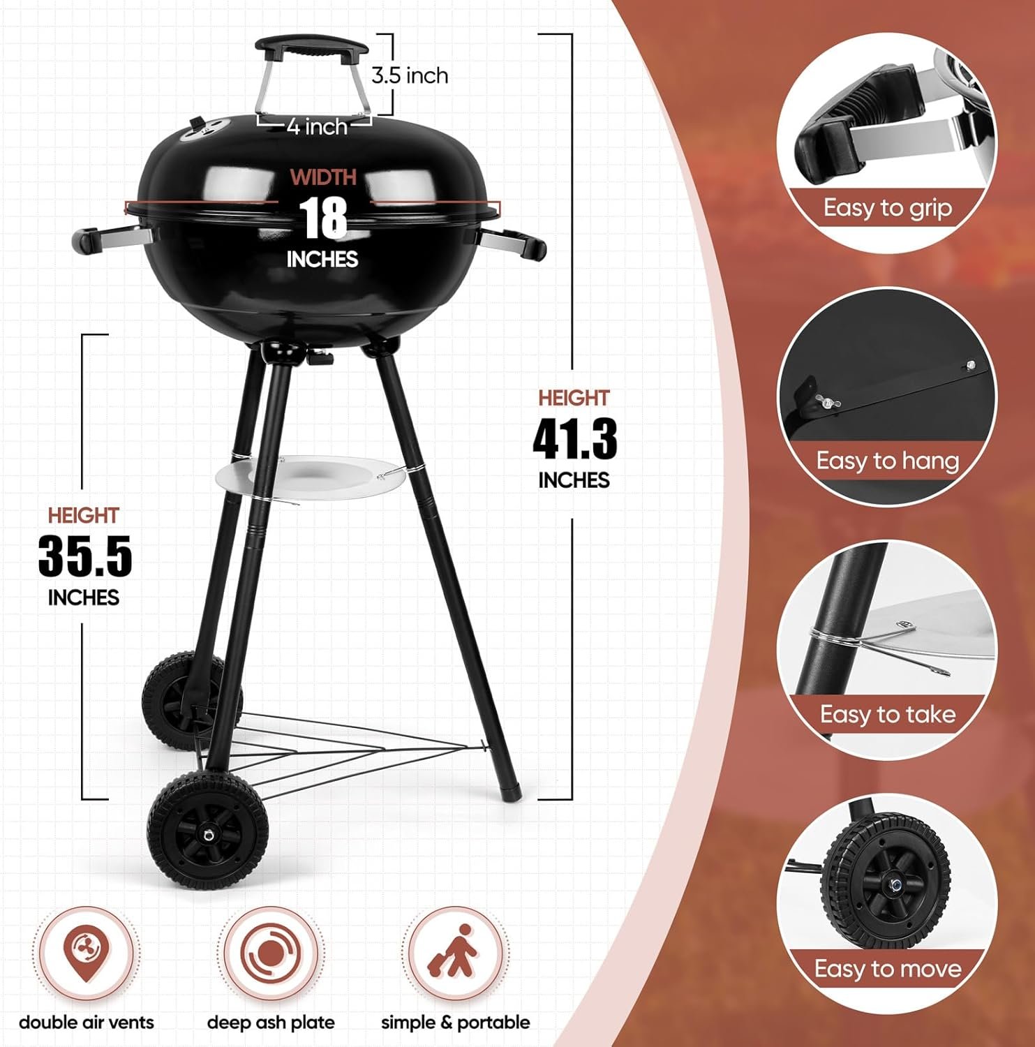 • METICULOUS DETAILS -2 adjustable dampers allow free control of internal temperature and airflow, Thickened legs reach 25mm in diameter greatly enhance frame stability and support entire BBQ grill, 4 supporting rivets hold cooking grate tightly without tipping, Ergonomic plastic handles ensure comfortable grip, Strong blow molding wheels provide smooth moving without wobbling or stopping suddenly