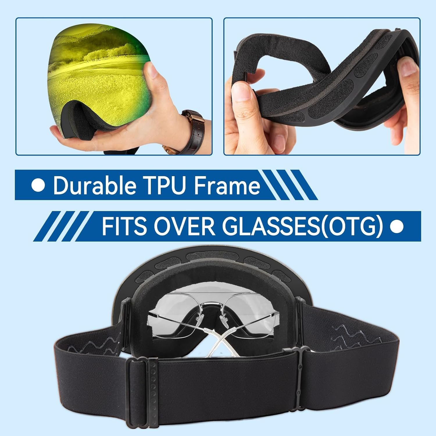 - 🏂【Design】The Ski Goggles PRO features an (Over the Glasses) design that lets you wear your glasses under the goggles. Providing zero interference and a perfect fit for your eyewear, allowing you to enjoy a clear vision and superior comfort.